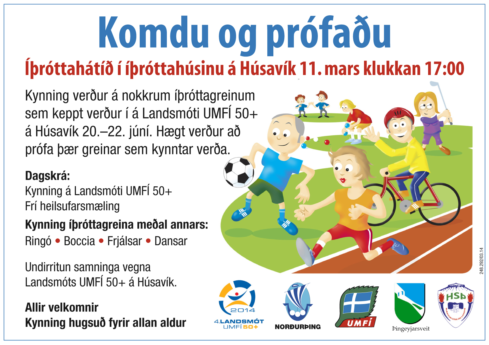 Ţriđjudaginn 11. mars kl. 17:00 verđur kynning á Landsmóti 50 ára og eldri á Húsavík. Kynntar verđa nokkrar íţróttagreinar sem keppt verđur í á landsmóti UMFÍ 50+ sem haldiđ verđur á Húsavík 20.–22. júní í sumar. Einnig verđur bođiđ upp á fría heilsufarsmćlingu.