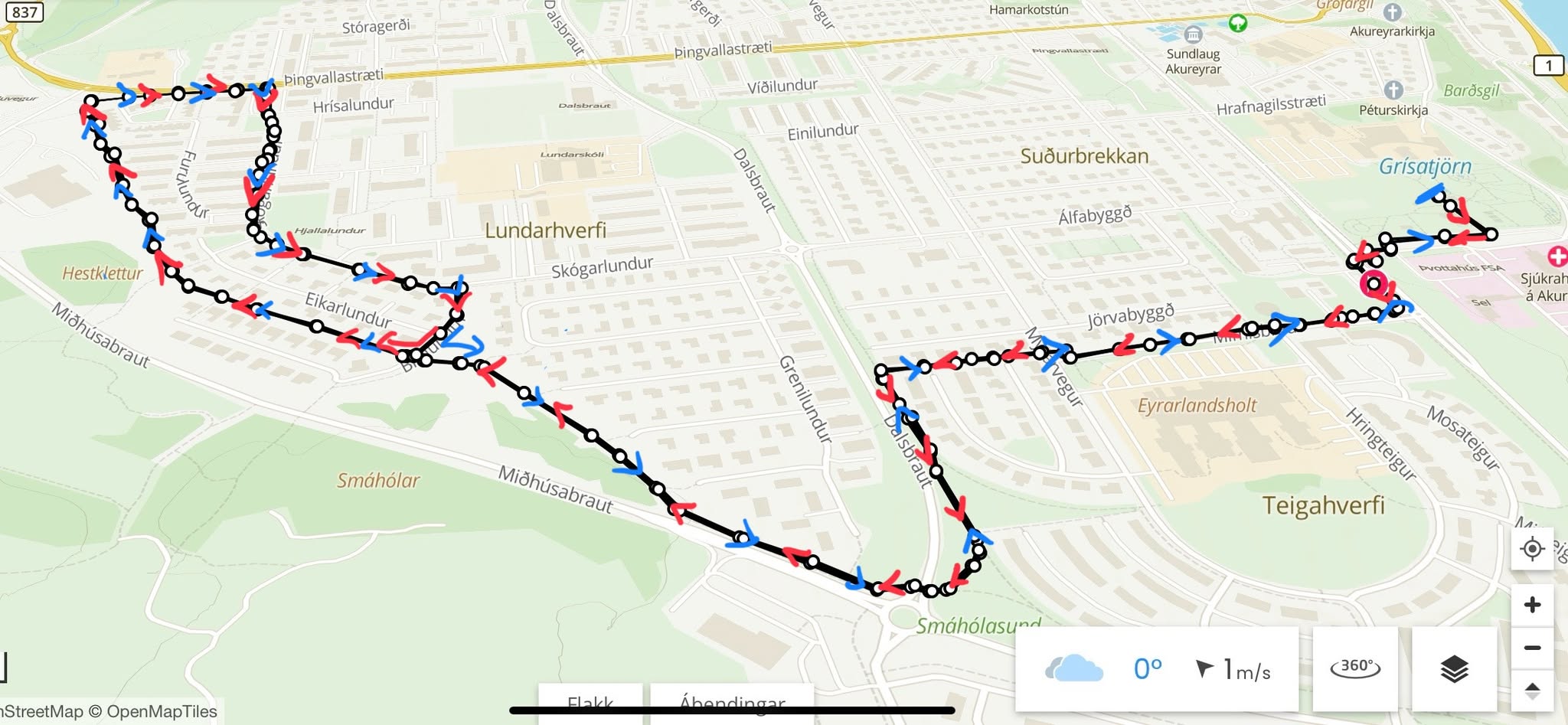Mæting í Lystigarðinn við LYST-kaffihús þar sem hlaupið er ræst til suðurs. Hlaupið er suður út úr Lystigarði við SAK, beygt til hægri og hlaupið upp að Þórunnarstræti. Farið er yfir gangbraut á Þórunnarstræti, beygt til vinstri og hlaupið að og upp Mímisbraut að Mýrarvegi. Við Mýrarveg er haldið beint áfram yfir gangbraut og inn á göngustíginn sem liggur að Dalsbraut. Við Dalsbraut er beygt til vinstri og haldið suður að hringtorgi við Bónus. Við hringtorgið er farið yfir gangbrautina, haldið beint áfram og upp á MS-stíginn og hlaupið er alla leið að Rauða kross húsinu. Þar er beygt inn Skógarlundinn og hlaupið að og inn Brálund, að MS-stígnum. Þar er beygt til hægri og hlaupinn er annar svona hringur (MS-stígur að Rauða krossinum, inn Skógarlundinn og að og inn Brálundinn). Þegar komið er í annað sinn að og inn Brálundinn (á MS-stíginn) er beygt til vinstri og sama leið farin til baka. Hlaupið endar við LYST-kaffihús.
